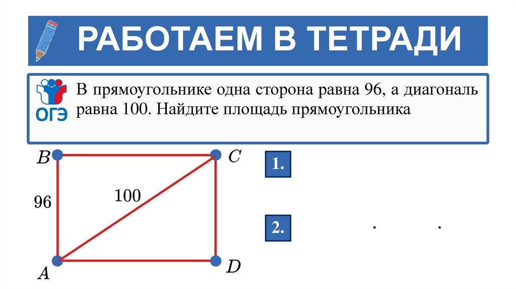 РАБОТАЕМ В ТЕТРАДИВ прямоугольнике одна сторона равна 96, а диагональ