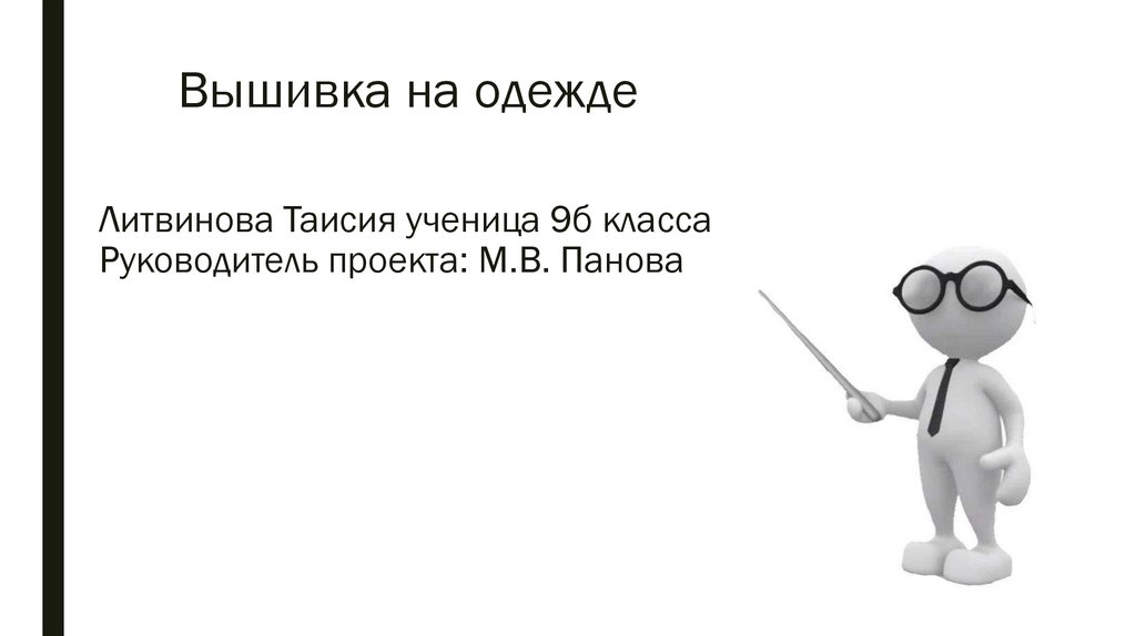 1. Вышивка на одежде Литвинова Таисия ученица 9б класса Руководитель проекта: М.В. Панова