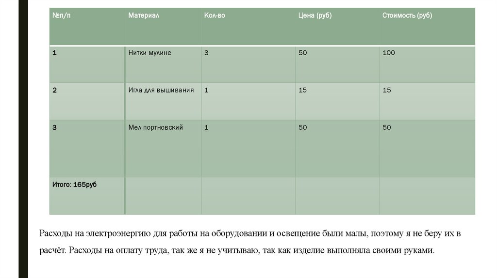 расчёт. Расходы на оплату труда, так же я не учитываю, так как изделие выполняла своими руками.