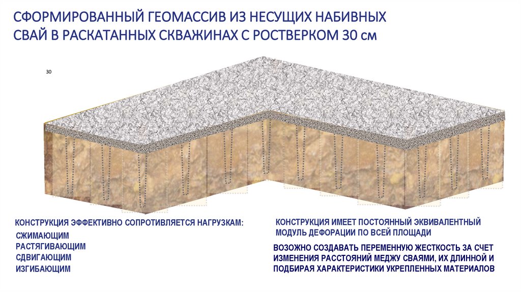 СФОРМИРОВАННЫЙ ГЕОМАССИВ ИЗ НЕСУЩИХ НАБИВНЫХСВАЙ В РАСКАТАННЫХ СКВАЖИНАХ С РОСТВЕРКОМ 30 см