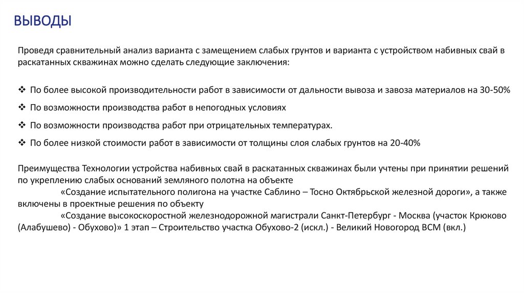 ВЫВОДЫПроведя сравнительный анализ варианта с замещением слабых грунтов и варианта с устройством набивных свай в