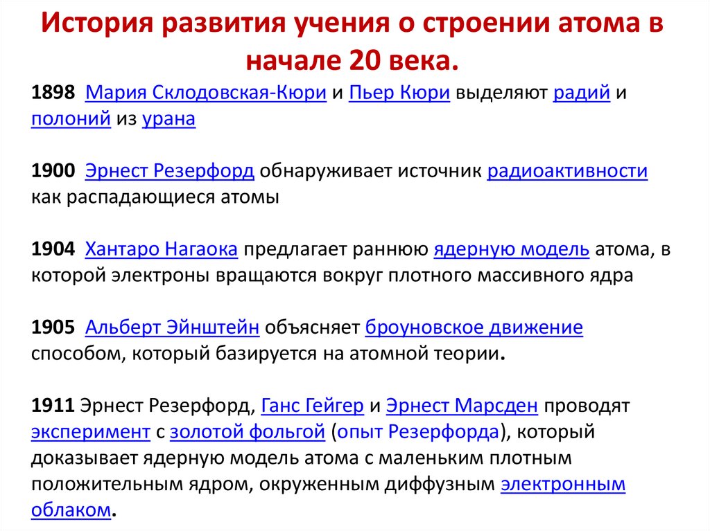 История развития учения о строении атома вначале 20 века.