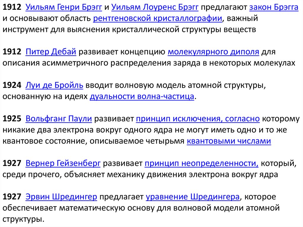 1912 Уильям Генри Брэгг и Уильям Лоуренс Брэгг предлагают закон Брэггаи основывают область рентгеновской кристаллографии, важный