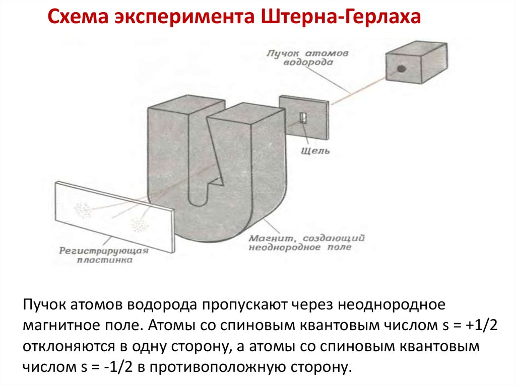 Схема эксперимента Штерна-ГерлахаПучок атомов водорода пропускают через неоднородное