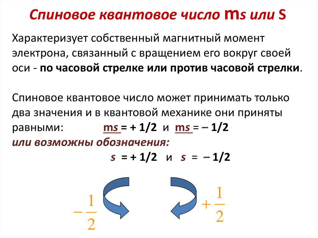 Спиновое квантовое число ms или SХарактеризует собственный магнитный момент