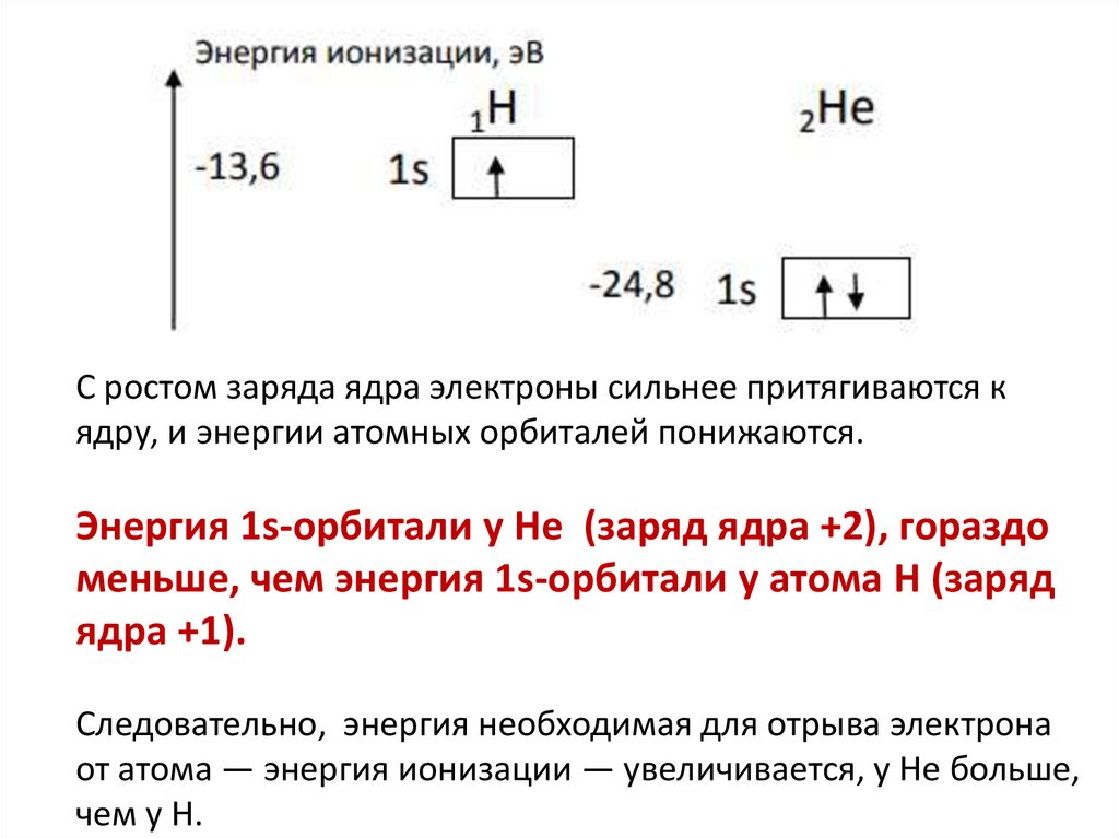 от атома — энергия ионизации — увеличивается, у He больше,