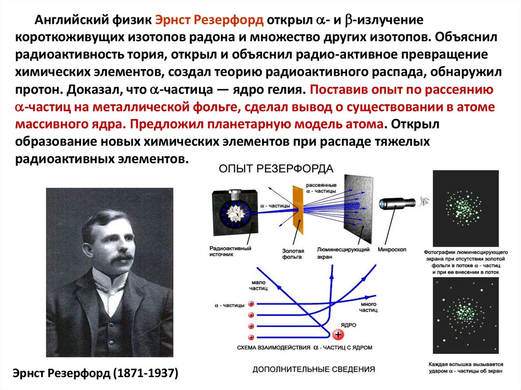 Английский физик Эрнст Резерфорд открыл - и -излучениекороткоживущих изотопов радона и множество других изотопов. Объяснил