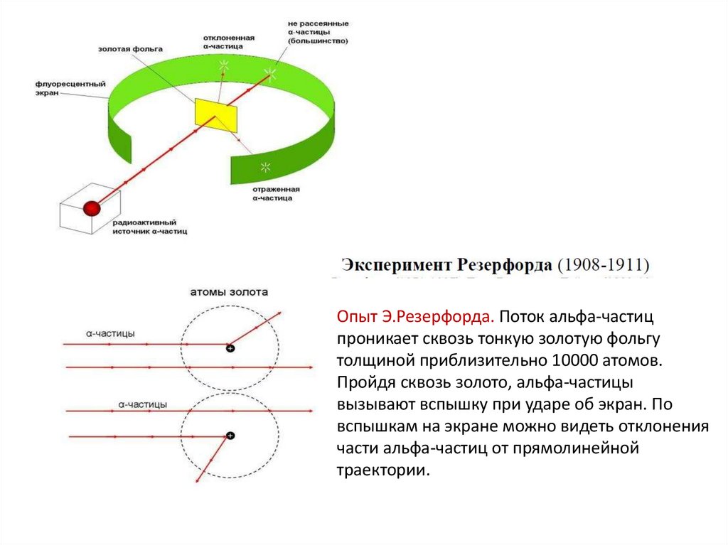 Опыт Э.Резерфорда. Поток альфа-частицпроникает сквозь тонкую золотую фольгу