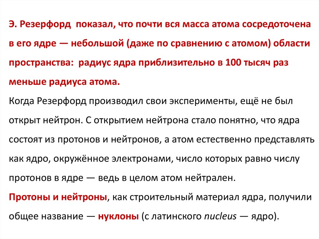 Э. Резерфорд показал, что почти вся масса атома сосредоточенав его ядре — небольшой (даже по сравнению с атомом) области