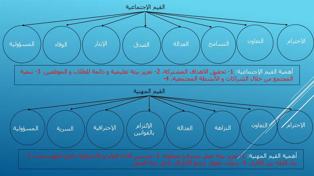 أهمية القيم المهنية -1 :تعزيز بيئة عمل صحية و متعاونة -2 ،تحسين االداء العام و االحترافية داخل المؤسسات-3 ،