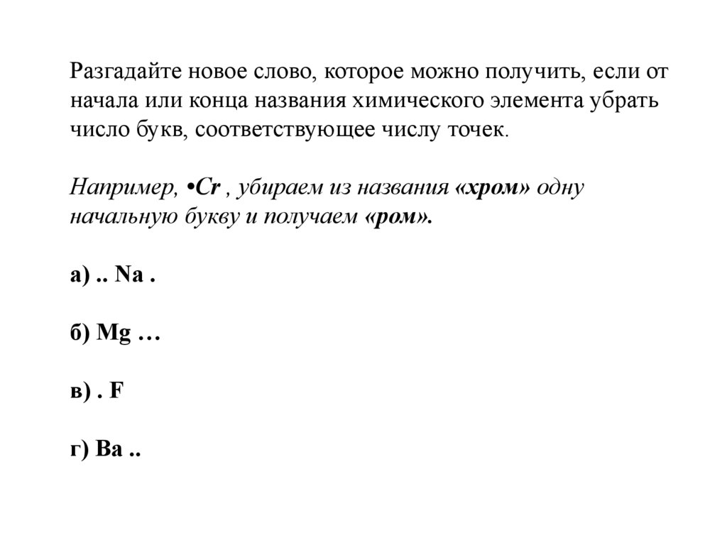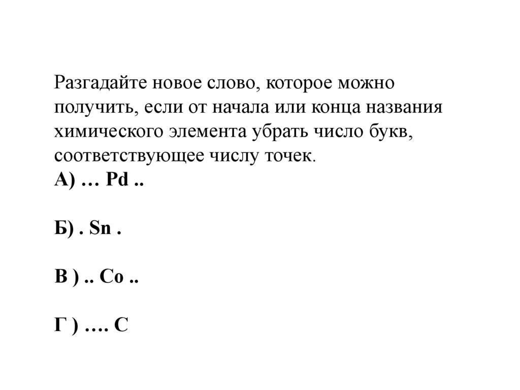Разгадайте новое слово, которое можно получить, если отначала или конца названия химического элемента убрать
