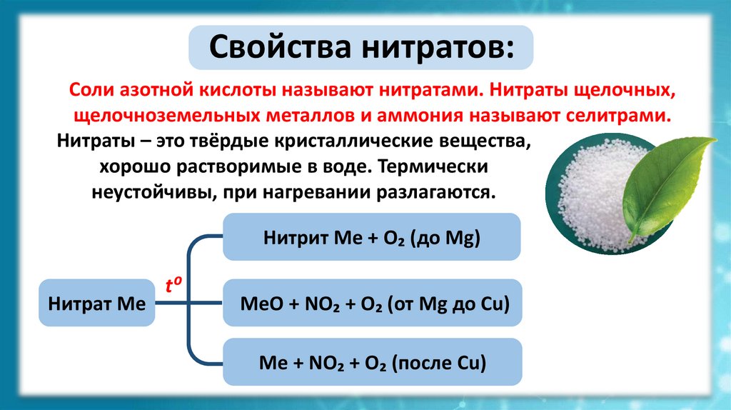 Свойства нитратов:Соли азотной кислоты называют нитратами. Нитраты щелочных,