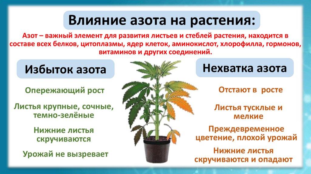 Влияние азота на растения:Азот – важный элемент для развития листьев и стеблей растения, находится в