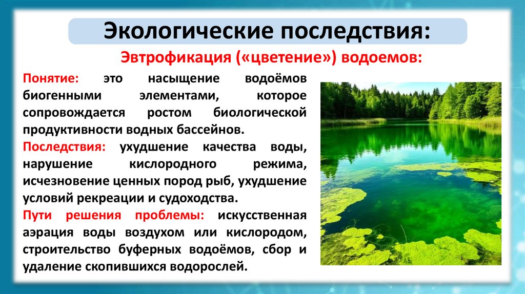 Экологические последствия:Эвтрофикация («цветение») водоемов: