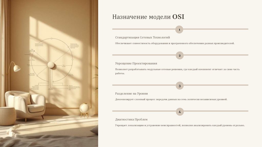 Декомпозирует сложный процесс передачи данных на семь логически независимых уровней.