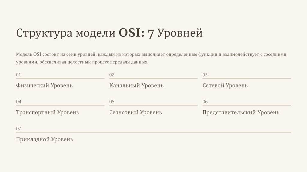 Структура модели OSI: 7 УровнейМодель OSI состоит из семи уровней, каждый из которых выполняет определённые функции и взаимодействует с соседними