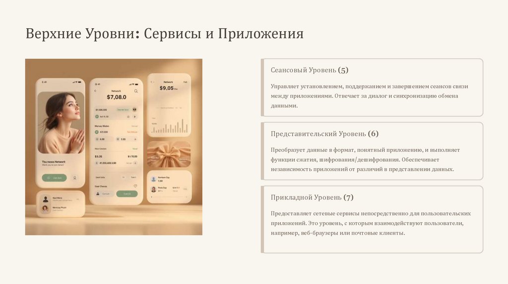приложений. Это уровень, с которым взаимодействуют пользователи,