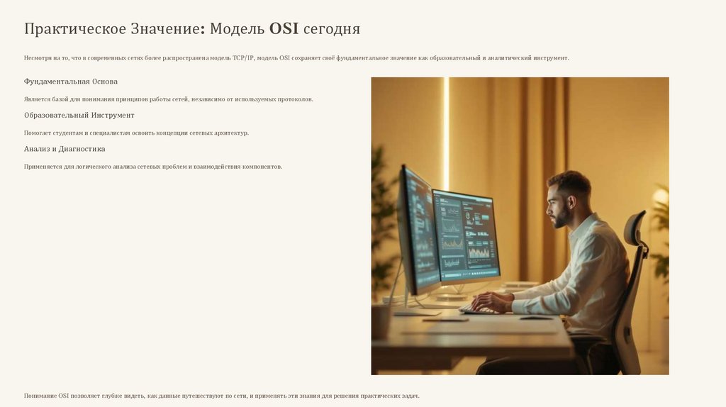 Практическое Значение: Модель OSI сегодняНесмотря на то, что в современных сетях более распространена модель TCP/IP, модель OSI сохраняет своё фундаментальное значение как образовательный и аналитический инструмент.