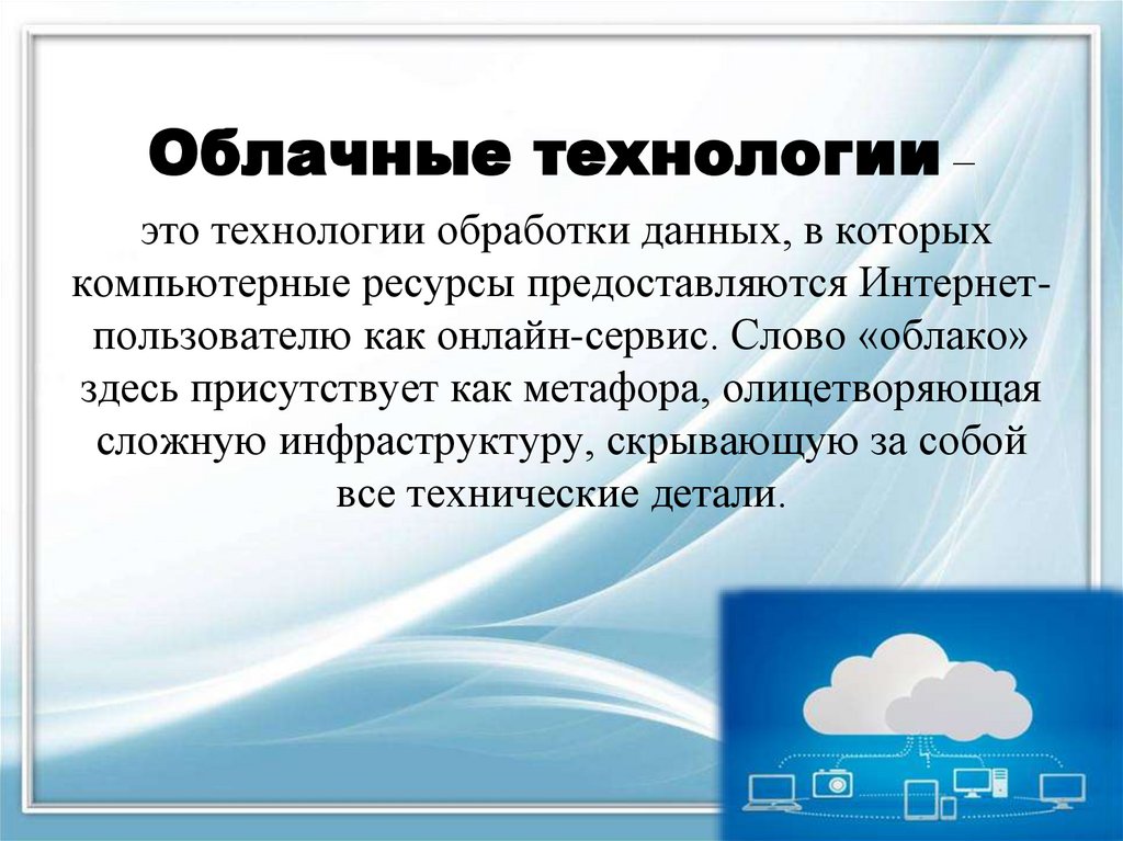 компьютерные ресурсы предоставляются Интернетпользователю как онлайн-сервис. Слово «облако»