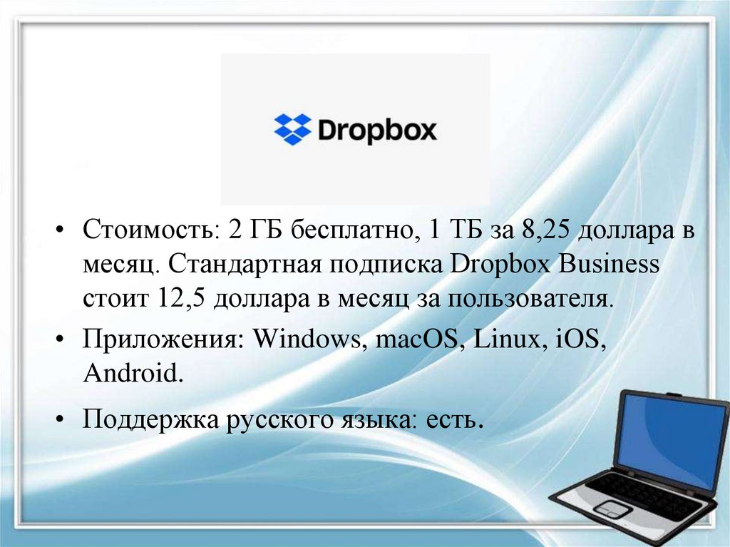 • Стоимость: 2 ГБ бесплатно, 1 ТБ за 8,25 доллара вмесяц. Стандартная подписка Dropbox Business