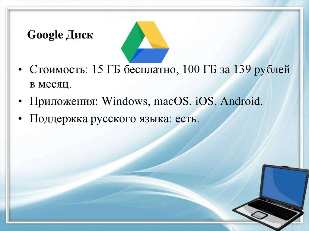 Google Диск• Стоимость: 15 ГБ бесплатно, 100 ГБ за 139 рублей