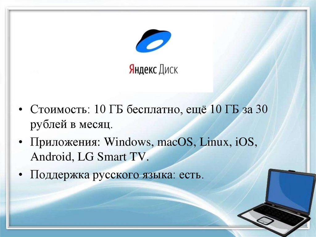 • Стоимость: 10 ГБ бесплатно, ещё 10 ГБ за 30рублей в месяц.