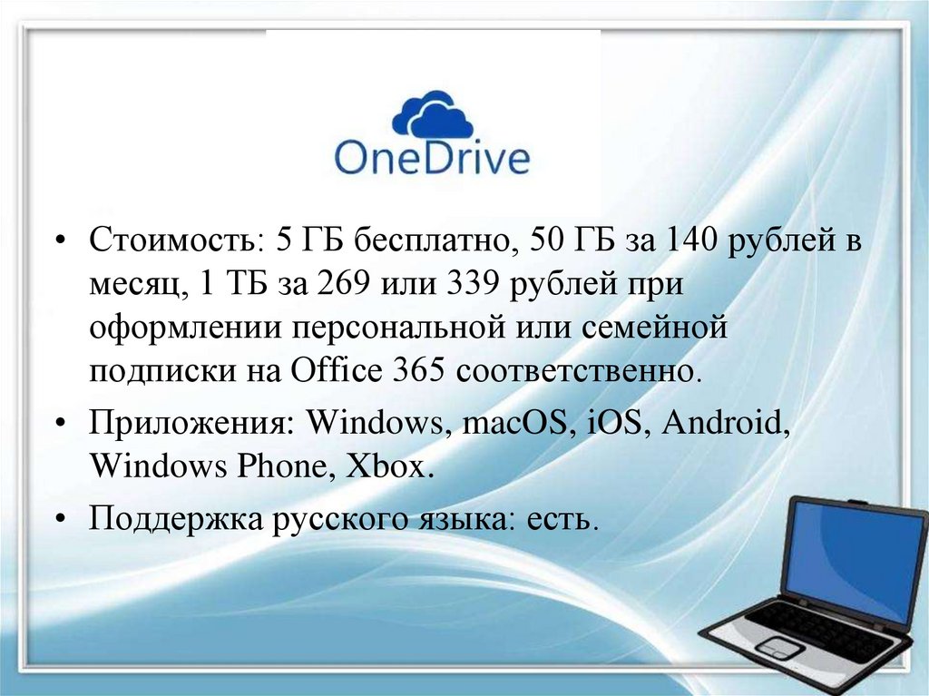 • Стоимость: 5 ГБ бесплатно, 50 ГБ за 140 рублей вмесяц, 1 ТБ за 269 или 339 рублей при
