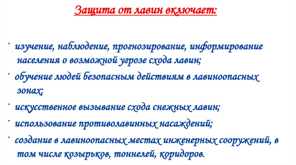 Защита от лавин включает:· изучение, наблюдение, прогнозирование, информирование