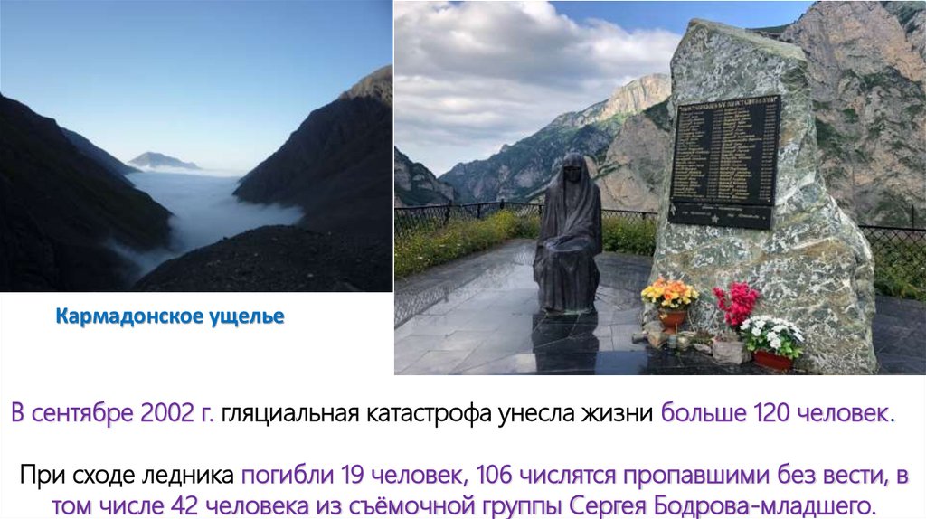 Кармадонское ущельеВ сентябре 2002 г. гляциальная катастрофа унесла жизни больше 120 человек.