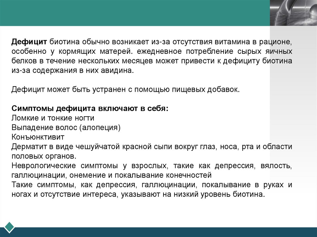 ногах и отсутствие интереса, указывают на низкий уровень биотина.