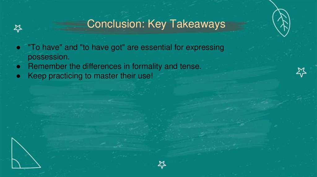 Conclusion: Key Takeaways● "To have" and "to have got" are essential for expressing