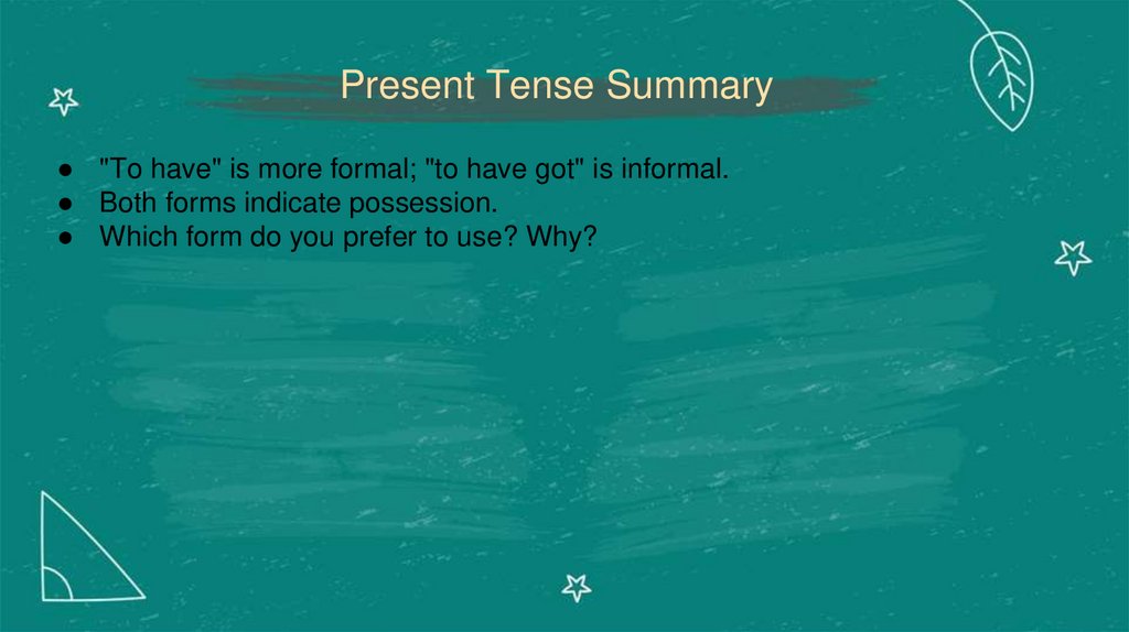 Present Tense Summary● "To have" is more formal; "to have got" is informal.