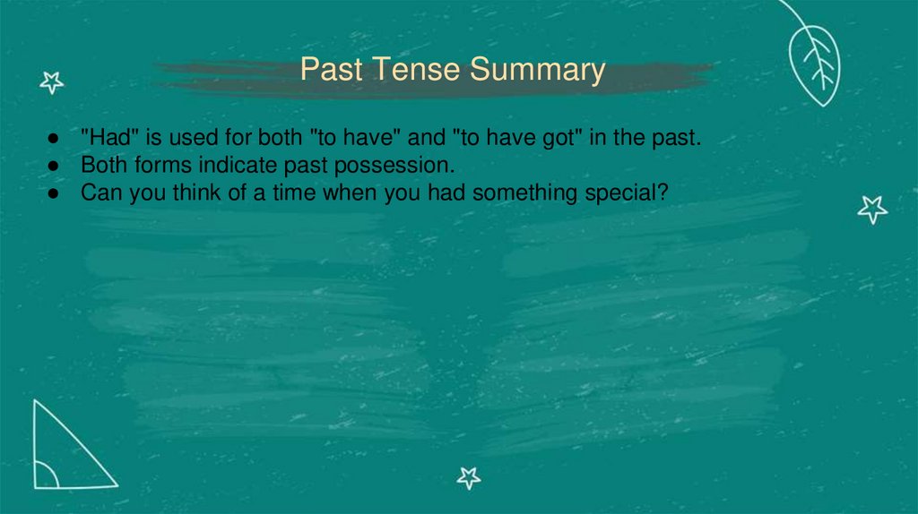 Past Tense Summary● "Had" is used for both "to have" and "to have got" in the past.