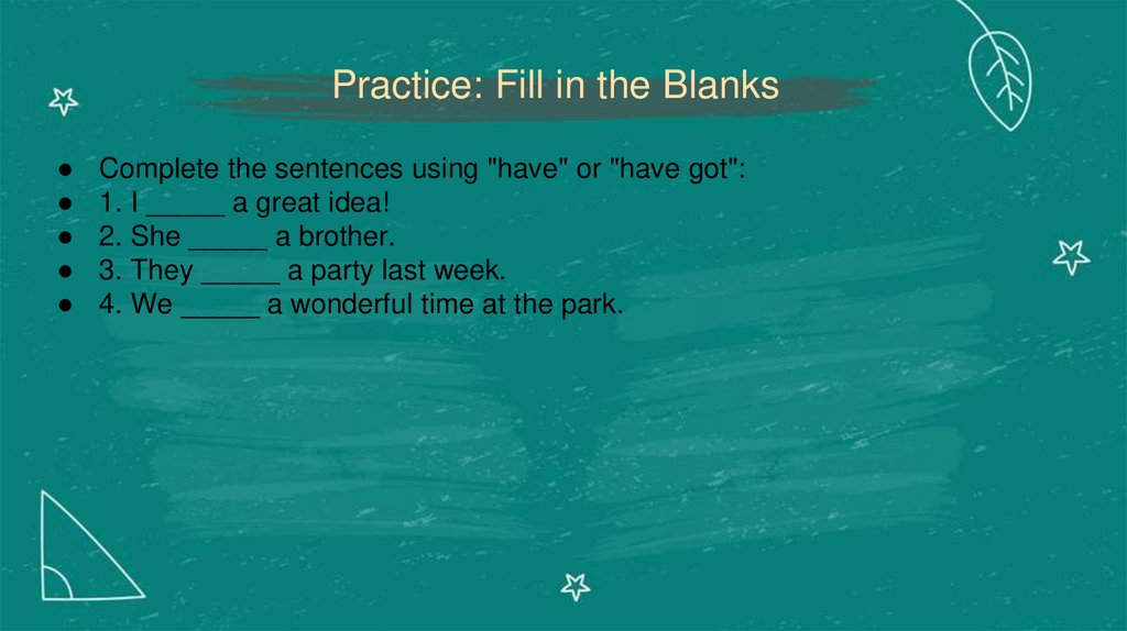 Practice: Fill in the BlanksComplete the sentences using "have" or "have got":