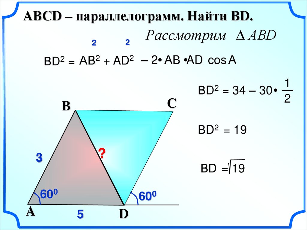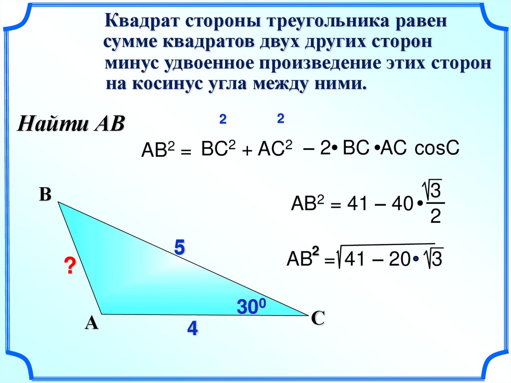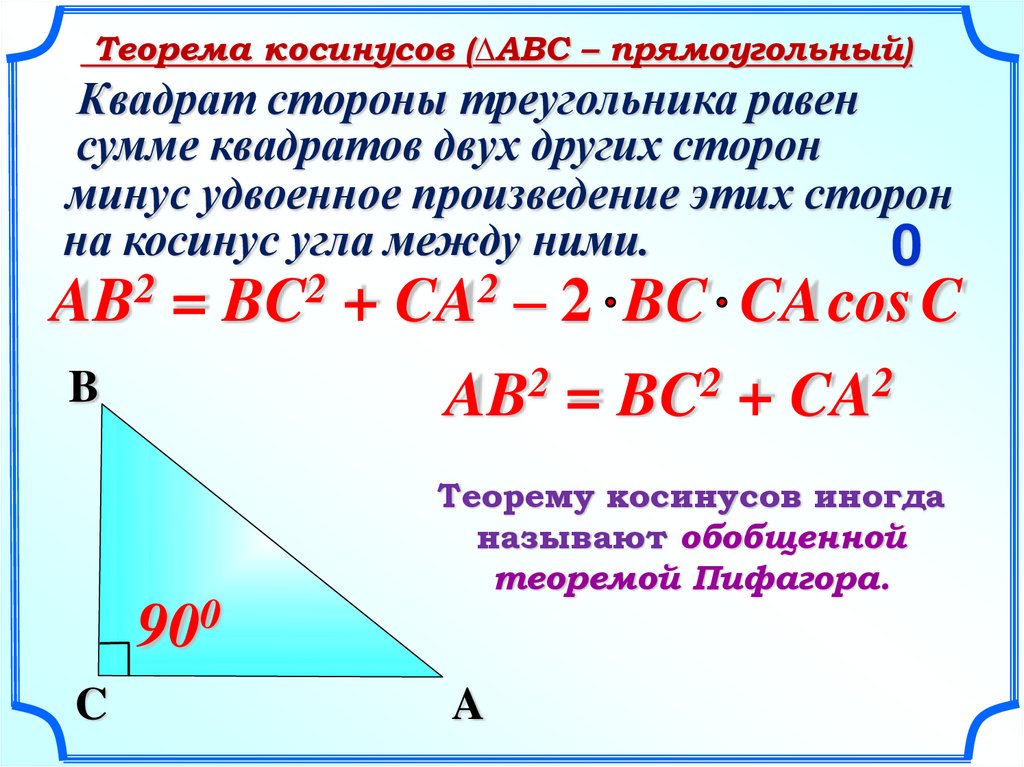 Теорема косинусов (∆АВС – прямоугольный)Квадрат стороны треугольника равен