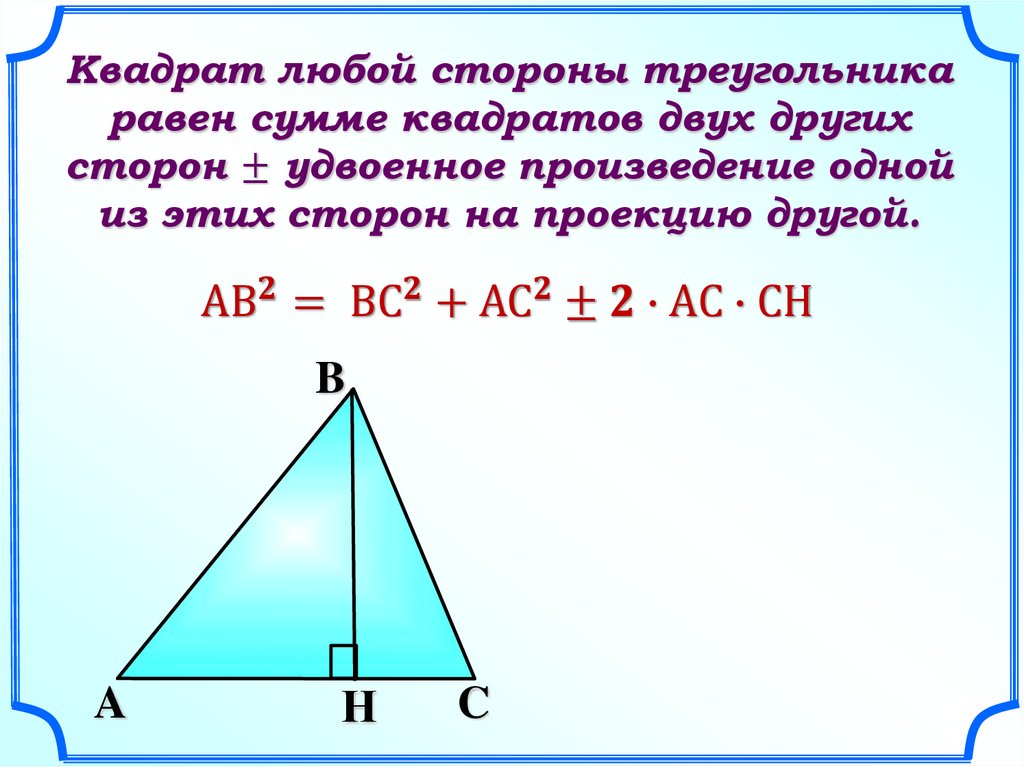 Квадрат стороны треугольника равенсумме квадратов двух других сторон