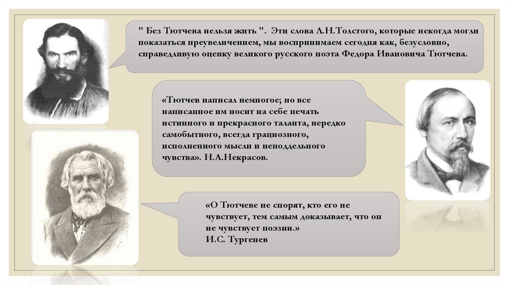" Без Тютчева нельзя жить ". Эти слова Л.Н.Толстого, которые некогда моглипоказаться преувеличением, мы воспринимаем сегодня как, безусловно,