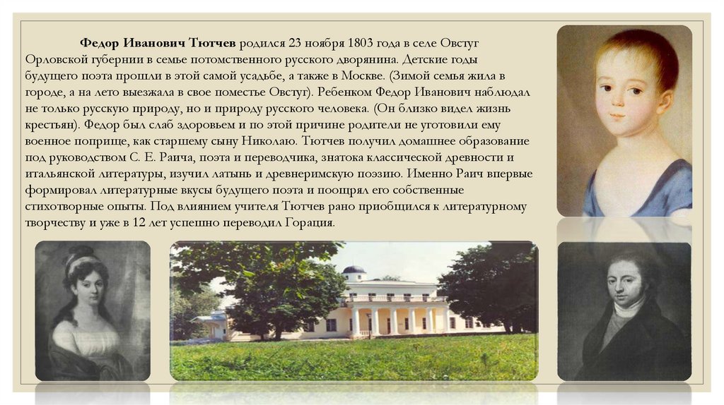 Федор Иванович Тютчев родился 23 ноября 1803 года в селе ОвстугОрловской губернии в семье потомственного русского дворянина. Детские годы
