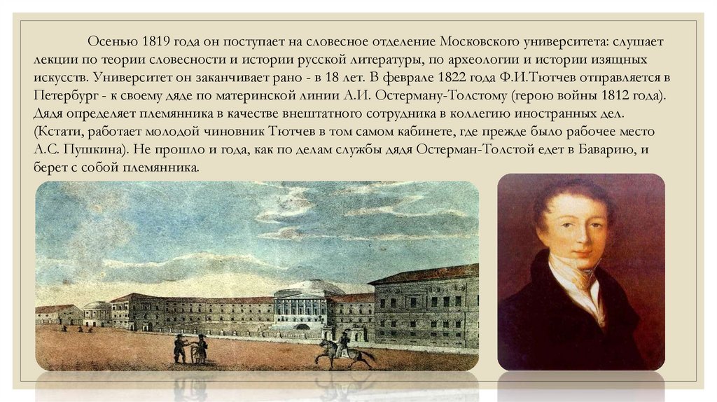 искусств. Университет он заканчивает рано - в 18 лет. В феврале 1822 года Ф.И.Тютчев отправляется в