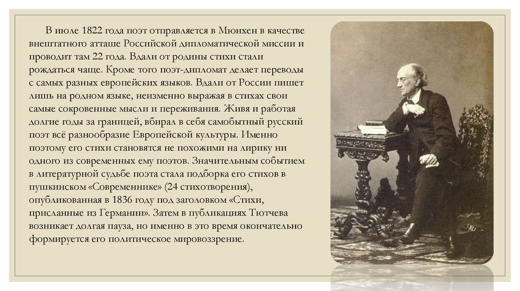 В июле 1822 года поэт отправляется в Мюнхен в качествевнештатного атташе Российской дипломатической миссии и
