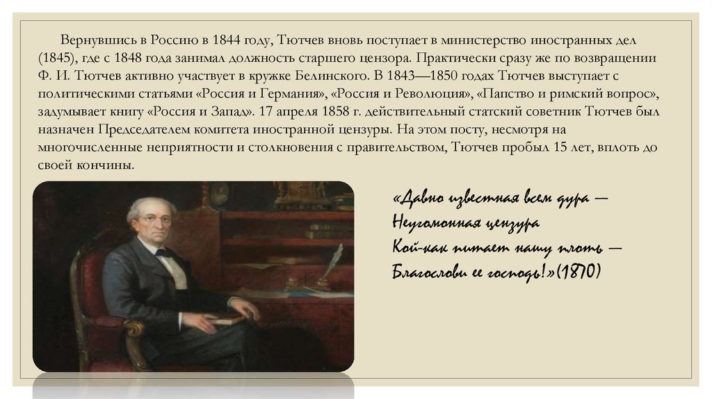 Вернувшись в Россию в 1844 году, Тютчев вновь поступает в министерство иностранных дел(1845), где с 1848 года занимал должность старшего цензора. Практически сразу же по возвращении