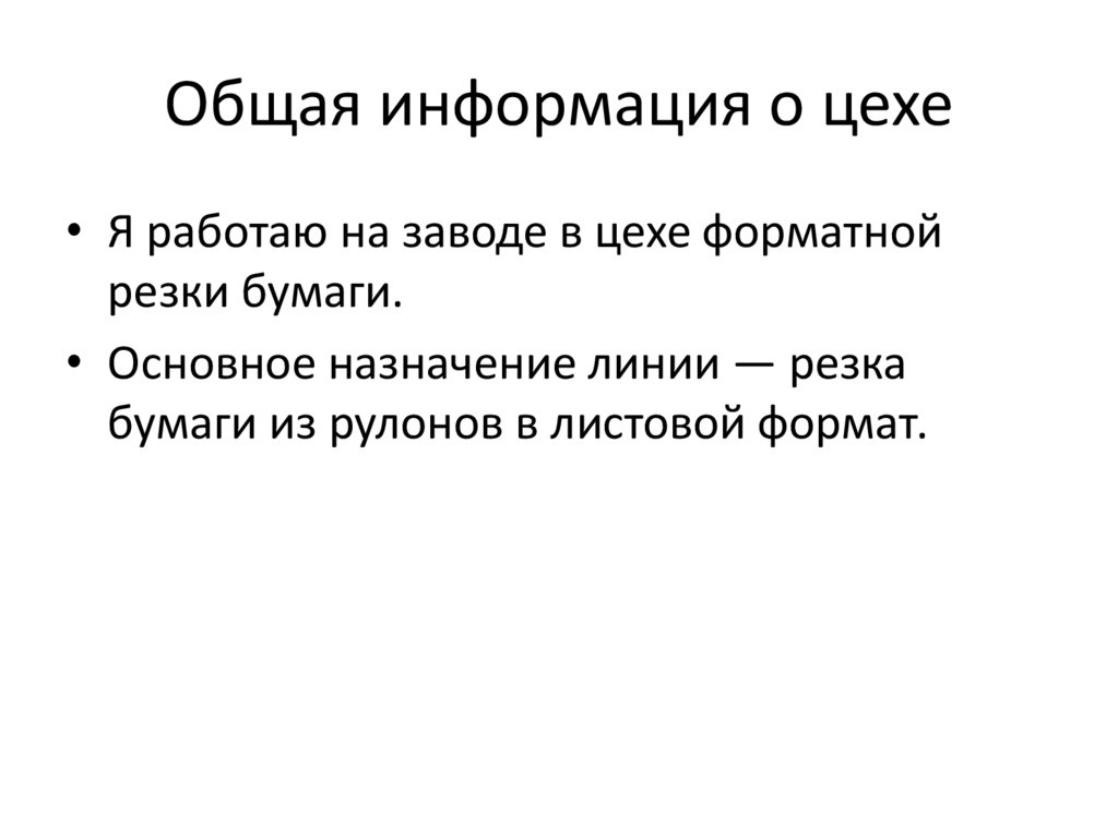 Общая информация о цехе• Я работаю на заводе в цехе форматной