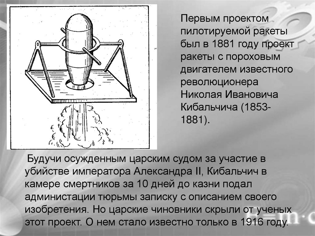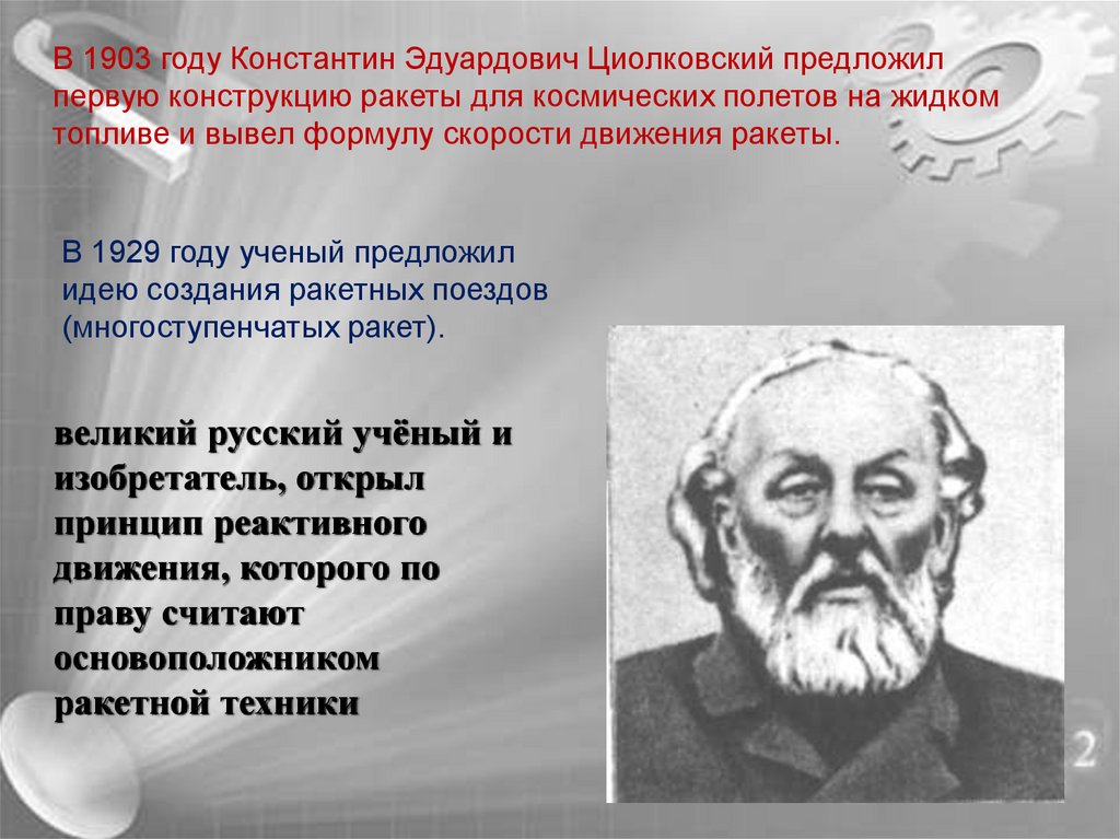 В 1903 году Константин Эдуардович Циолковский предложилпервую конструкцию ракеты для космических полетов на жидком