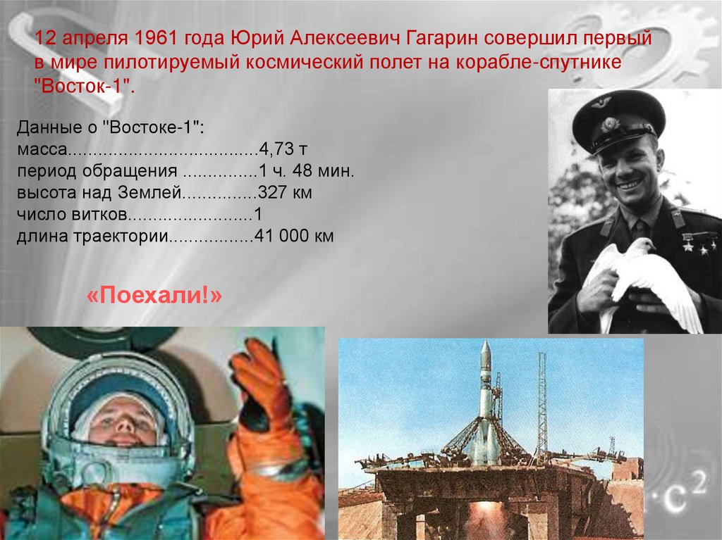 12 апреля 1961 года Юрий Алексеевич Гагарин совершил первыйв мире пилотируемый космический полет на корабле-спутнике