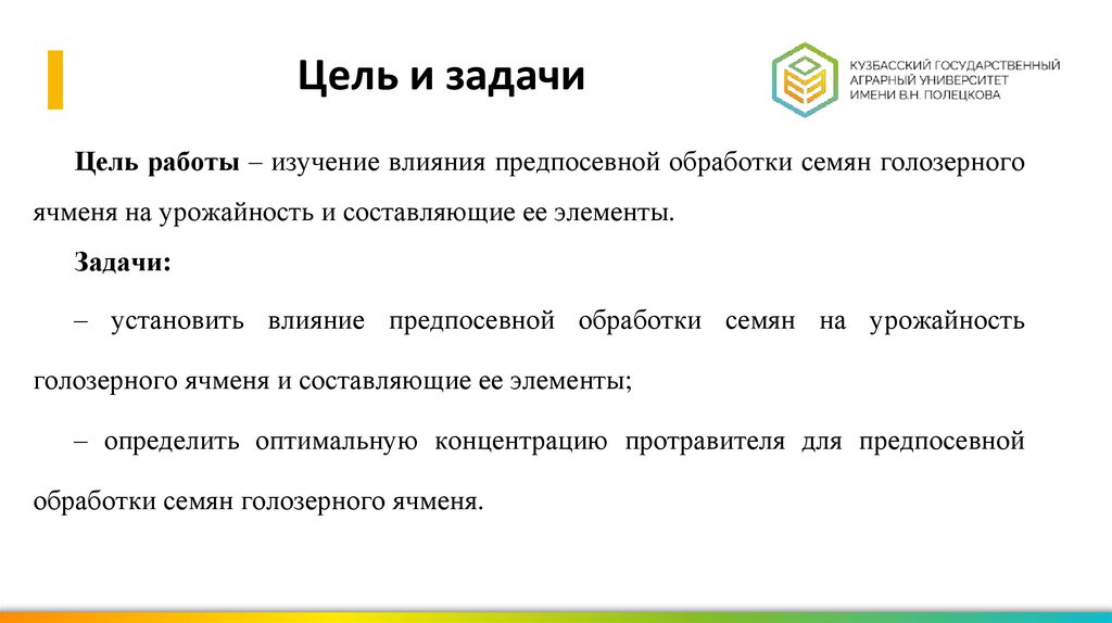 Цель и задачиЦель работы – изучение влияния предпосевной обработки семян голозерного