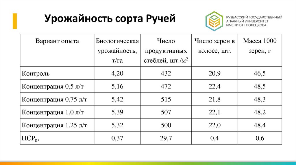 Урожайность сорта РучейВариант опыта