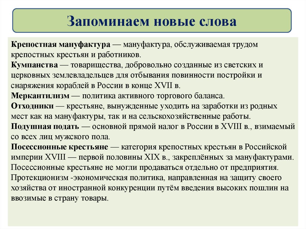 Запоминаем новые словаКрепостная мануфактура — мануфактура, обслуживаемая трудом