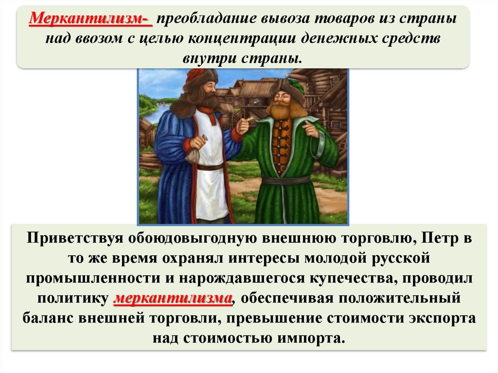Меркантилизм- преобладание вывоза товаров из странынад ввозом с целью концентрации денежных средств