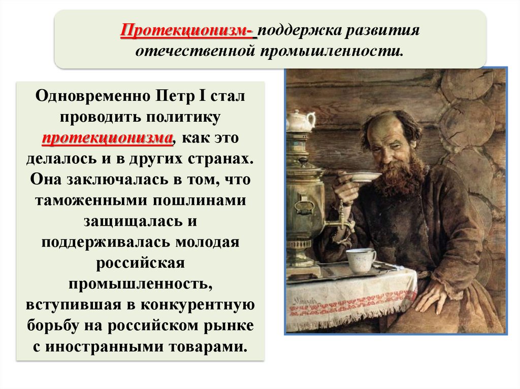 Протекционизм- поддержка развитияотечественной промышленности.