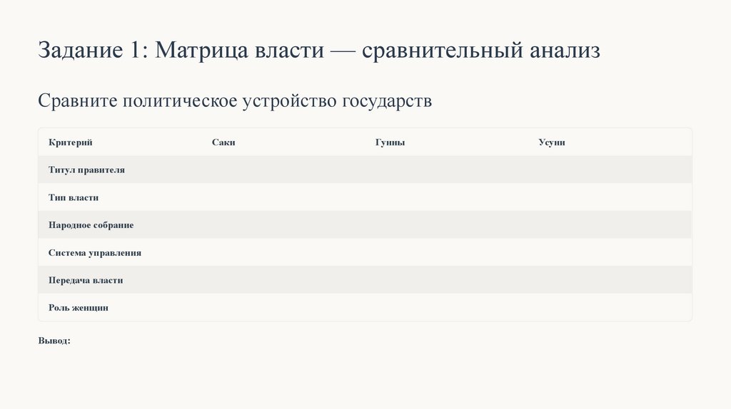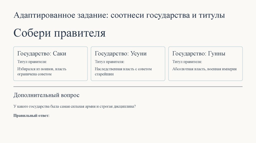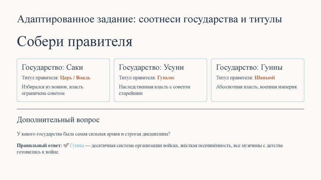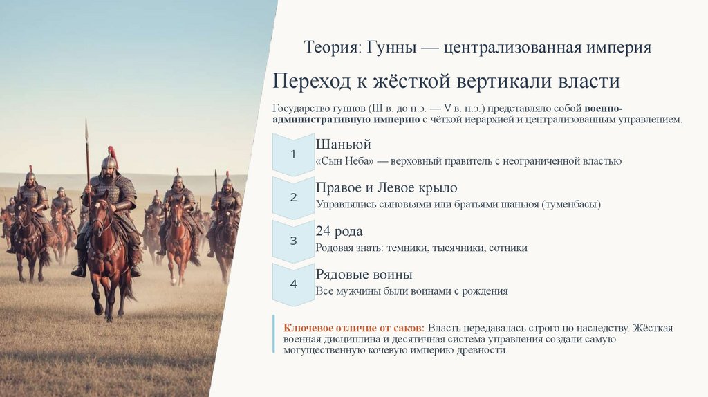 Правильный ответ: ✅ Гунны — десятичная система организации войска, жёсткая подчинённость, все мужчины с детства